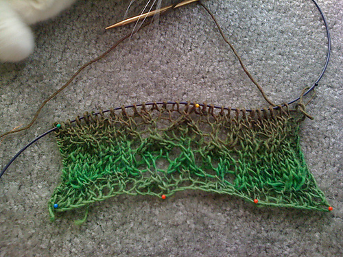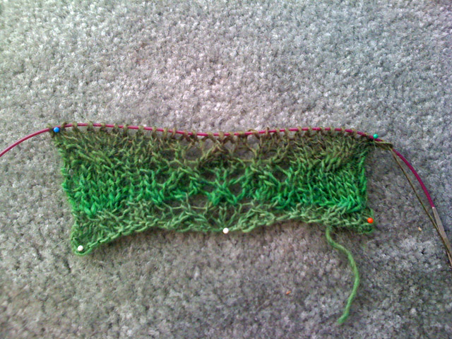 It looked like mess on the 7s as you can see. It’s amazing what changes one size down will wrought on a project. It looks so much better now! I think it may also be that the Knit Picks needles I changed to are more comfy in my hands.