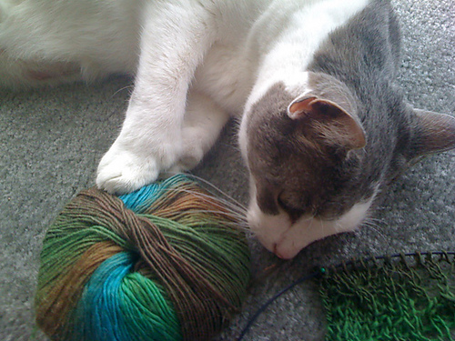 Also of note is that Dijjit likes this yarn. Normally, she is indifferent to yarn at best. Usually she goes right for my knitting needles, even if they are the straights or dpns. She’s wacky.