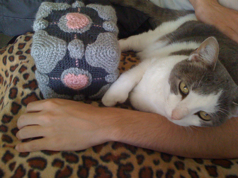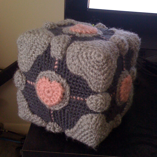 It’s hard to overstate my satisfaction with the Weighted Companion Cube I made for my friend Mike for his birthday. The original pattern was just stuffed and not weighted, so I made a cube out of plastic canvas and suck a mesh bag full of rocks into it before stuffing.