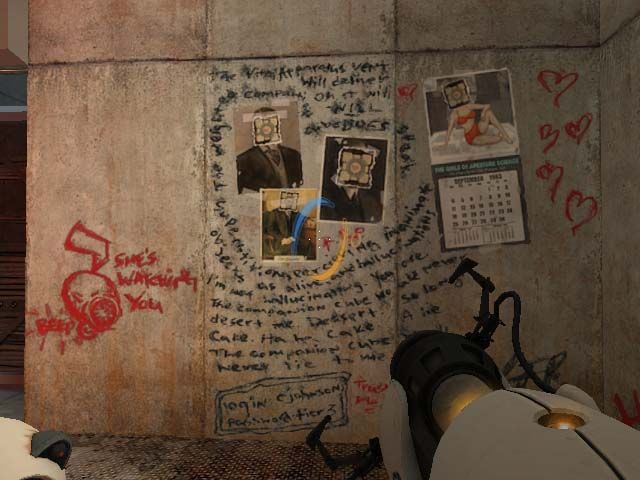 You use cubes from the beginning of the game to push buttons, but partway through you are introduced to a special cube with hearts on it called the “Weighted Companion Cube”. You are repeatedly told not to fall in love with the cube and that it hasn’t any feelings, but you can see from scribblings on the wall that other test subjects have fallen in love with the cube.