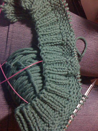 I got a couple of skeins of KnitPicks Swish Bulky with the giftcard one of my friends gave me at my bridal shower, and worked on both of them. First, I made a Capucine, which is now finished. But here’s a WIP picture of it!